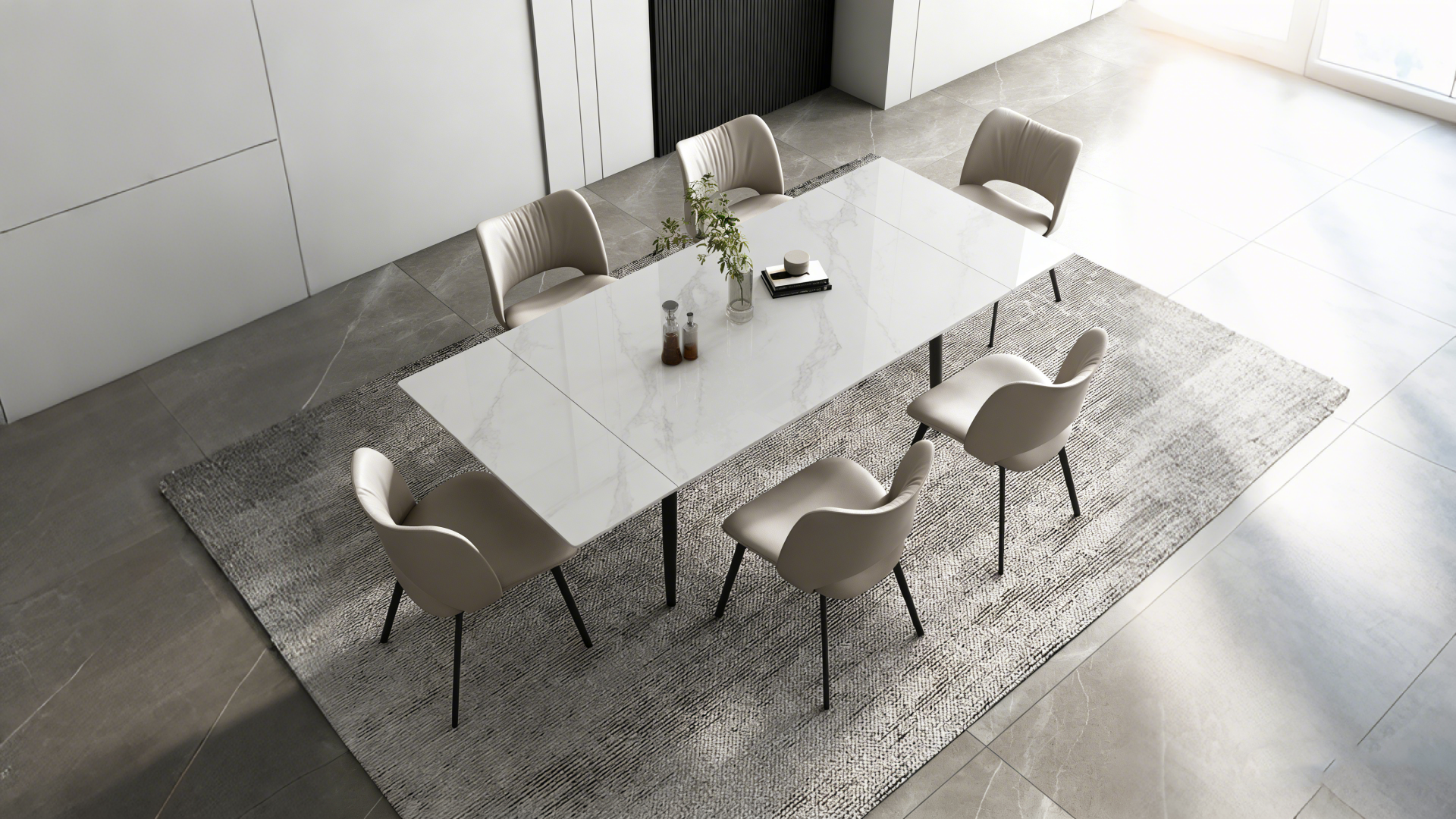 Features an extendable stone dining table. The durable tabletop is perfect for gatherings with family and friends.